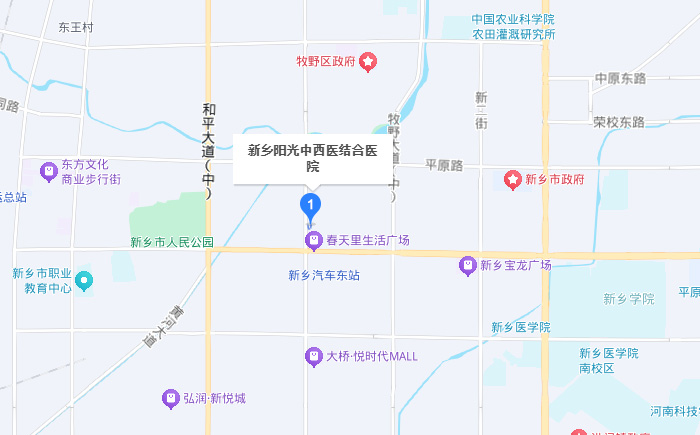 公交路線: (1)乘坐38路、7路、67路到紅旗分局站下車;乘坐35路、38路、25路到汽車東站(方便站)站下車; (2)乘坐23路到豐華街金穗大道站下車,步行至新鄉(xiāng)陽光中西醫(yī)結合醫(yī)院
